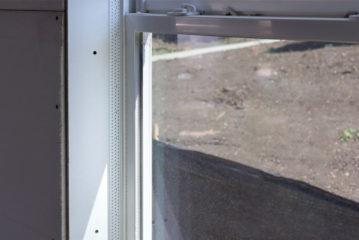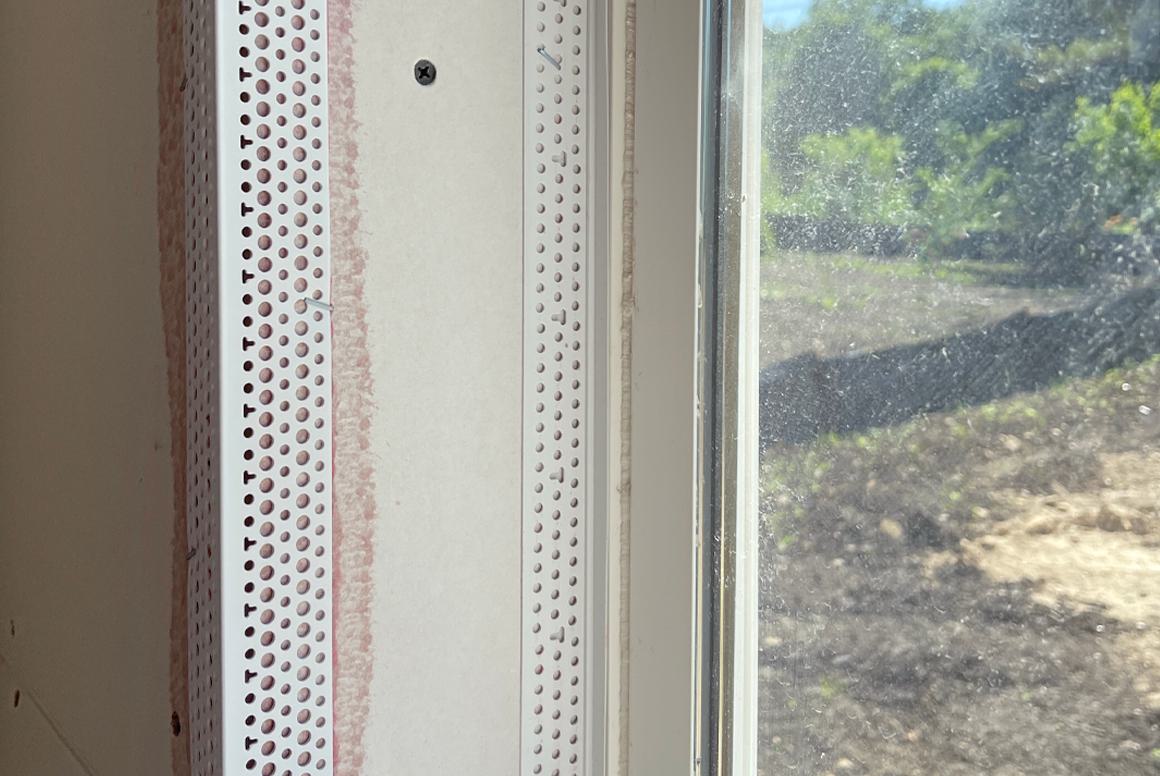 For finishing around building components like windows and doors, where the drywall is sometimes butted too close to slip a return leg behind it — or when backing materials, like acoustical sealant, have been added — Flat Tear Away can be a lifesaver. Its tear-off strip serves as a protective mask to create clean finished edges.